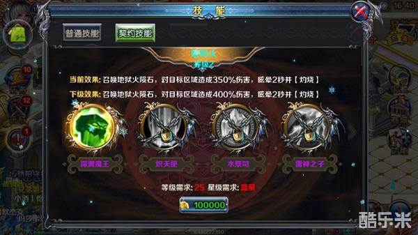 其中地狱火是契约技能,可以在“技能”面板升级,就像主角自己的技能一样。