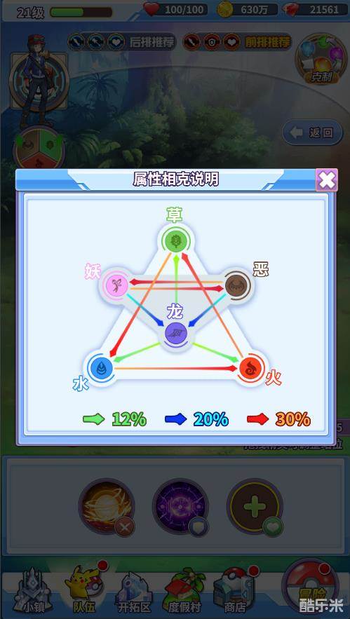在编队界面的右上角有一张属性克制表,表格中共有六个属性,这六个属性之间存在相互克制关系,且不同属性间克制强度也有不同,分别用绿色(-12%)、蓝色(-20%)和红色(-30%)这三个箭头来对各属性精灵克制关系做了详细的表达。玩家可以通过表内的属性关系进一步的了解属性克制功能。