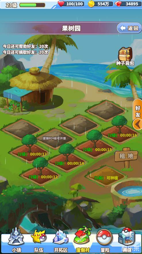 玩家可以通过度假村商店购买种子然后将其种在果树园里,种子的等级越高可收获的时间也越长,奖励也越丰厚,并且种植土地还可以升级哦。