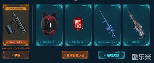 完成认证之后,即可领取以下礼包:CBJ-MS(永久)、猫耳头盔(7天)、王者之石(1颗)、M82A1-水枪(7天)、炼狱(3天)