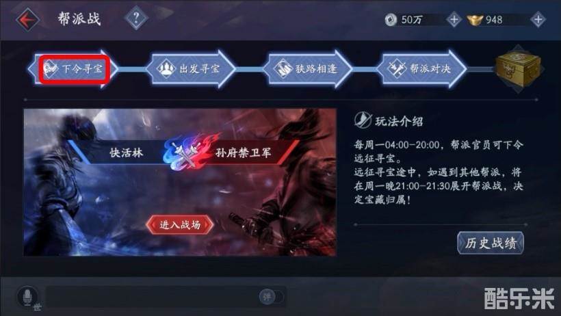 每周一报名时间内,帮派官员都可以在帮派战界面报名“寻宝”,如果遇上同样觊觎同一片宝藏的帮派,那就要为之奋战到底。