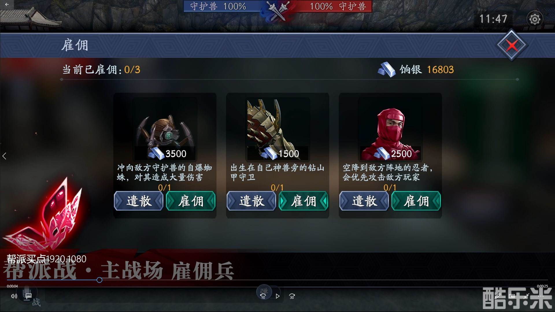 另外,帮派战内设有雇佣按钮,副战场获得的饷银可供帮派官员在此购买或遣散不同效果的雇佣兵供己方主战场突破敌阵。