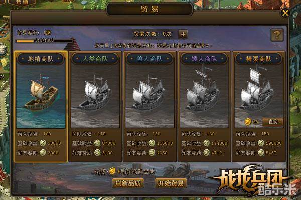 在大黑《战龙兵团》贸易玩法中,玩家一开始进入贸易玩法页面,会得到地精商队。玩家可通过刷新品质按钮,对商队进行刷新,并且有机率刷出更高等级的商队。玩家在刷新商队的同时,则需要消耗5金币。此外,玩家也可以直接通过花费38金币,直接购买精灵商队,来获得更多银币奖励。