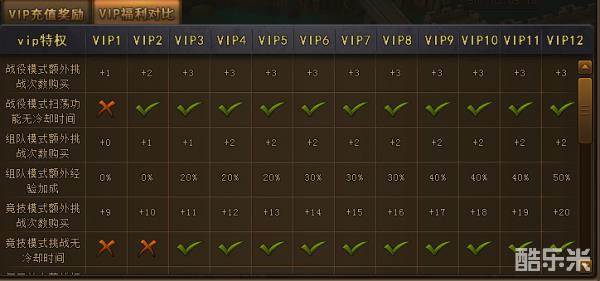 (二)关于充值问题:要长期玩的玩家建议开区充值个V3,V3也就一百RMB,几包烟钱?不要以为充值了一百就给游族做贡献,如果你长期玩的话自己考虑一下,毕竟V3以下请愿、民户、地牢比别人少,获得的资源长期积累下来会慢慢落后,毕竟V3还可以在前期战役模式和竞技没有时间冷却,这样说实话节约不少时间特别在晚上10点实话抢一名就有作用了,什么类型游戏都是基础。如果真想真正玩的玩家不想挨打的建议充值V5,不要盲目充值,充值的时候在活动一览看看那个活动最实惠就充多少,慢慢来!(附带一张VIP的福利图)