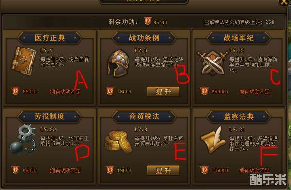 (四)关于功勋的使用:功勋的最大来源在未改版之前在国战中获得,改版之后在遗迹中获得,遗迹中需要打掉对方的基地功勋奖励好多。建议在刚刚开区的时候功勋全部用于下图F,因为在前期请愿的经验很多,你F点的高请愿经验会变多,先点到20级。之后在可以点提高银子的,军纪先在做好提升,也学几天就可以看出效果,你等级高,自然战力也高,可以成为领先者!