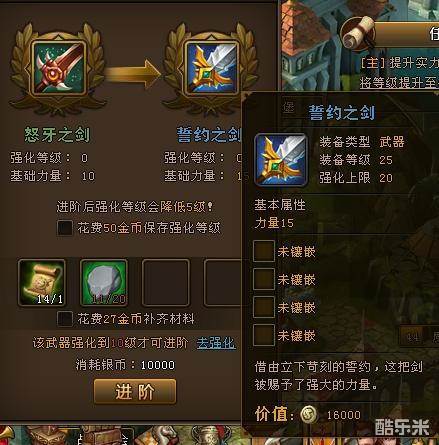 进化成誓约之剑力量是15 ,而守护之剑初始力量是18 ,这之间就存在3点力量属性差 这是其一 其2, 大家上图也看到 誓约之剑 的强化上限是20 而守护的强化上限是25 ,这里又相差5点力量,也就是说 同样条件下 装备这2把不同武器并且强化满 就相差8点力量 而且这只是一件装备 如果是3个英雄12件装备呢? 战斗力是不是就高判立下了? 所以很多人一直觉得玩新区 心想我不是RMB 我就省下那12件装备就可以省下12000金币用在别处上 这样想过的玩家有木有? 但是这只是一时的利益 ,越往后装备升级上去了强化上限都会不同的提高 这时你就会发现光装备这一小块战斗力就差人一大截. 当初真不该贪这点小便宜. 这游戏好就好在 新号刷竞技排名的话能有将近2~4000左右金币 ,这点还是不错的,让很多普通玩家也能拥有一些金币,如果没这个系统的话 我肯定也就不会说这么多,毕竟充钱玩的毕竟不算多, 普通玩家才是最多 的, 所以说 钱你不花在刀刀上你花哪?该用不用 该省不省什么的最2了~