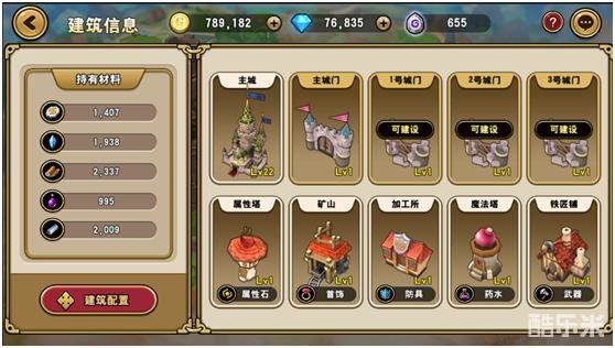 建筑分类:主城、属性塔、加工所、魔法塔、矿山、铁匠铺、城门