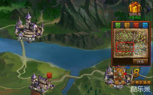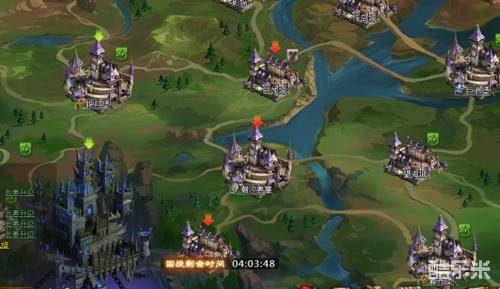 世界地图右边,有小地图标示世界争霸各国占领城池情况,绿色代表翡翠之国,红色代表炎玉之国、蓝色代表霜晶之国,黄色代表圣金之国。世界争霸期间闪动的白色小点代表正在交战城池。在地图框下输入城池名称点击【搜索】,画面可直接移动至搜索城池。
