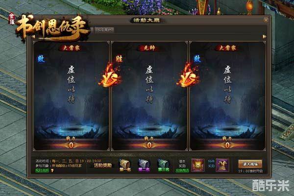 萌乐网《书剑恩仇录》中,45级以上的玩家可以在每周一、三、五晚上19:00-19:30参加比武大会活动。玩家进入活动场景后将会自动分配为红花会与御林军两个阵营,在活动场景中击杀对方玩家即可获得一个连斩数,连斩数越高,获得的奖励越多。玩家死亡则连斩数清零。