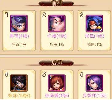 阵容分为前排以及后排,玩家需要通过升级阵法,提高阵法效果。最好在前排是以防御系武将为主,这样可以抵挡更多爆发伤害,而后排以谋士之类的为主,在玩家对战过程之中也能够更有效的攻击。
