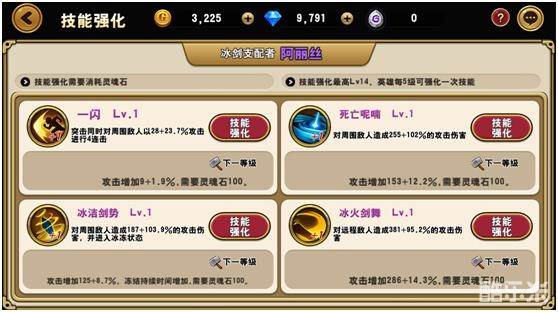 英雄可通过灵魂石升级技能,提升技能效果。英雄等级每提升5级,技能可升1级。灵魂石可通过成就和乱斗战获得,还可通过好友赠送获得。