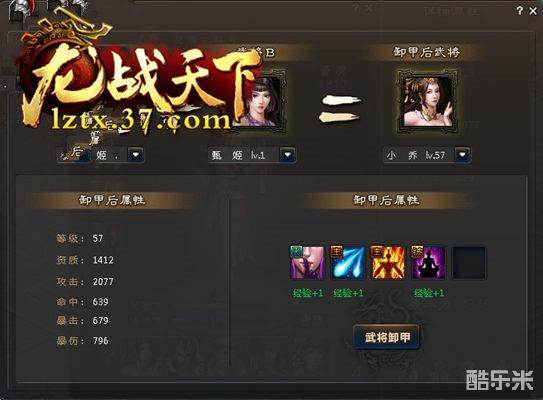 37《龙战天下》武将卸甲是增加武将技能经验的主要手段。相同技能增加5点经验,不同技能增加1点经验。武将技能效果随经验的提升而提升,经验越高,技能的威力也会越大。另外玩家还可自主选择卸甲后的武将形象。
