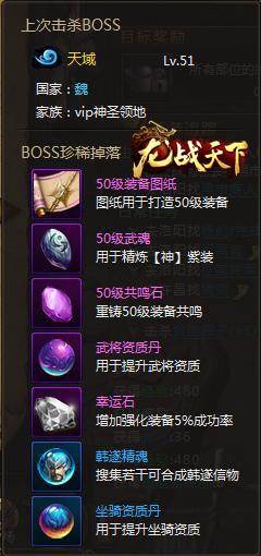 最后就来看看世界BOSS的丰厚奖励吧!50级BOSS掉落的物品都非常珍贵,所以大家一定尽量参与每天的世界BOSS活动。40级BOSS的掉落也很吸引人,是你前期能够迅速当高富帅的关键!好了,话不多说,大家赶紧参与到紧张刺激的世界BOSS中吧!!!