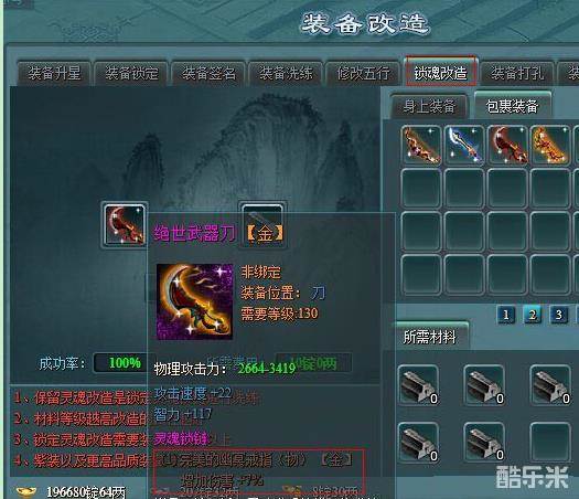 在王城争霸游戏中,装备的改造包括,装备强化,装备锁定,装备签名,装备洗练,修改五行,锁定灵魂改造,装备打孔,装备镶嵌。那么装备如何改造呢?