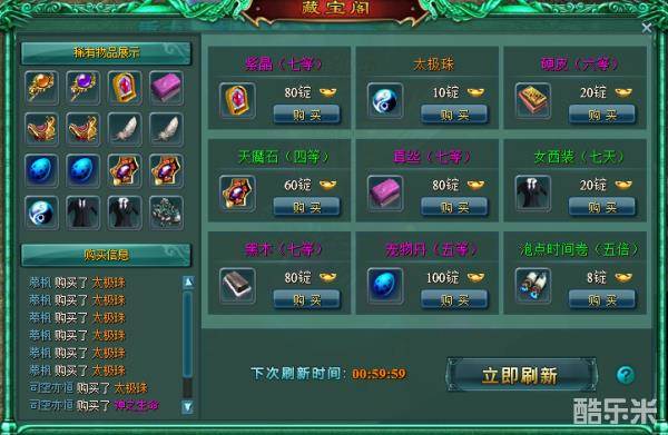 1.藏宝阁每隔1小时刷新一次,每次刷新9个物品