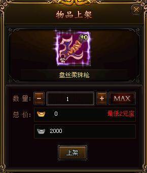 在弹出框内填写出售该物品的价格,然后点击确定,可以同时填写银两(最低设置2000银两)或元宝(最低设置2元宝),买者须支付元宝或者银两进行购买。卖家得到的银两和元宝会扣掉10%手续费,元宝至少收1元宝,银两至少收1000银两。