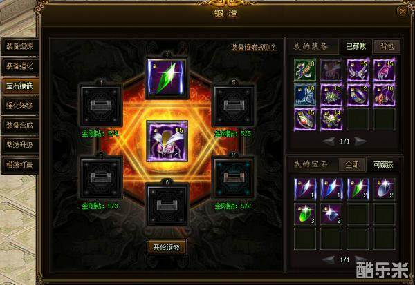 将宝石放入孔中,点击开始镶嵌即完成宝石的镶嵌。已镶嵌的宝石也可以取出,镶嵌和取出都是免费的。