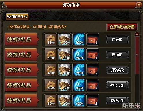 统领这个不用说吧,越是统领等级高领取的东西越多,铜钱也多。即使非RMB玩家也是有机会免费领取的,是吧,多少是多呢,积攒成多也是可行的。