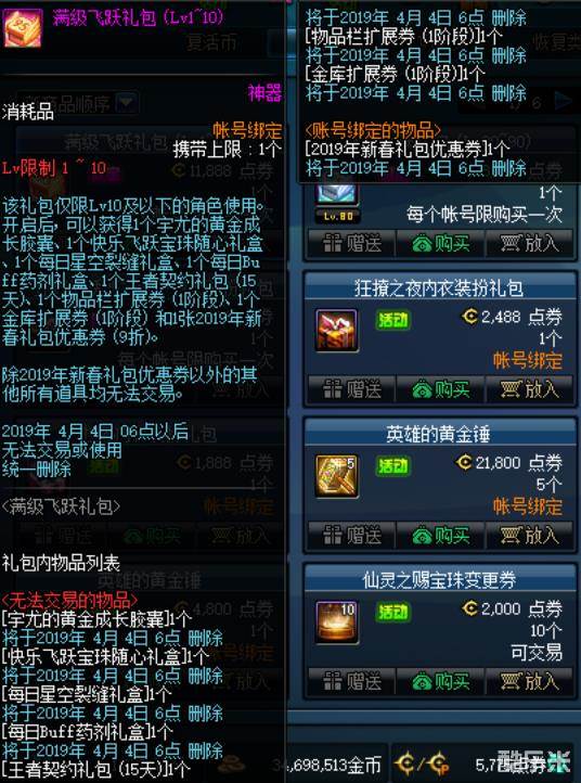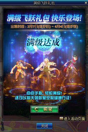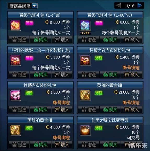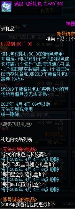 商城限时上架2款满级飞跃礼包,1~10级可使用礼包售价11888点券,80~90级可使用礼包售价8888点券,仅限使用点券购买,每个礼包限购1次。