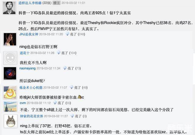 对于这位楼主的爆料网友们的也是议论纷纷,有网友表示“没想到ning也是钻石打野王啊,想当初我孩子哥也是两个号韩服王者600点,没用啊,宁王人家比赛打的好啊(委屈),不过为什么没有Duke的,我杜克不当人啊?”