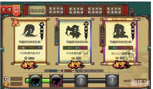武林求贤会有三种收徒模式,分别为十里挑一,百里挑一,万里挑一,每次可刷新出一个弟子,等待时间越长的招募的弟子品质越高。少门主参加求贤会的次数越多,获得的声望越高,将有特殊的弟子求访。