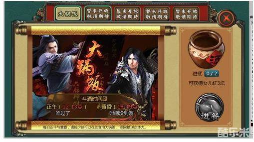 大锅饭使用后可补充20点体力,每天参加两次大锅饭可获得女儿红3瓶,女儿红可在剑试天下中使用。