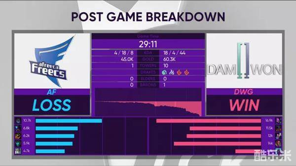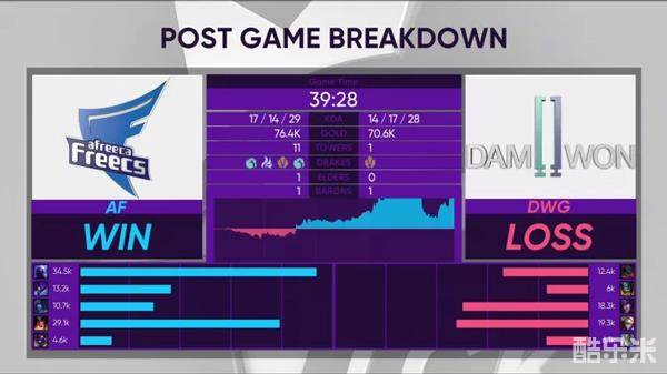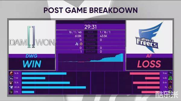 20分钟,DWG经济领先3K;24分钟,雷克塞在野区被DWG中野击杀,顺势拿下大龙,再团灭AF,利用大龙BUFF,DWG推下AF全部外塔;