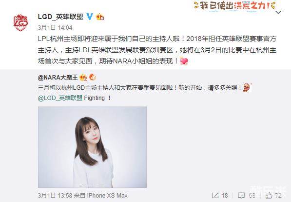 今日LPL春季赛LGD对阵VG,虽然LGD遗憾未能赢下这场比赛,但这场比赛有来有回,激烈而精彩。值得一提的是,赛后采访由一位新人的主持小姐姐完成,这位主持小姐姐名叫Nara,赛前就已经发布了微博称自己未来将常驻于LGD杭州主场。