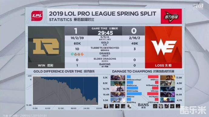 比赛进入中期,WE掌控优势在推塔上取得领先,给RNG这一套打中期的阵容巨大的进攻压力。而RNG不急不躁的找机会抓住了WE的失误,通过连续两波WE人员不齐团战拿到大龙,逆转比赛锁定胜局。