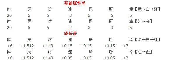 从这个很简单的规律,我们可以得出,属性每提升一阶【从绿→白→红→金】,则在原来的成长上加6