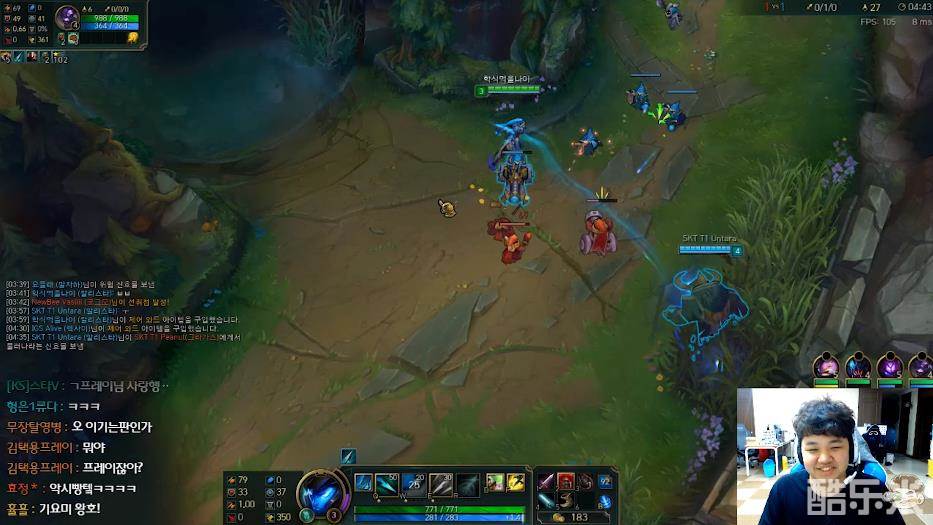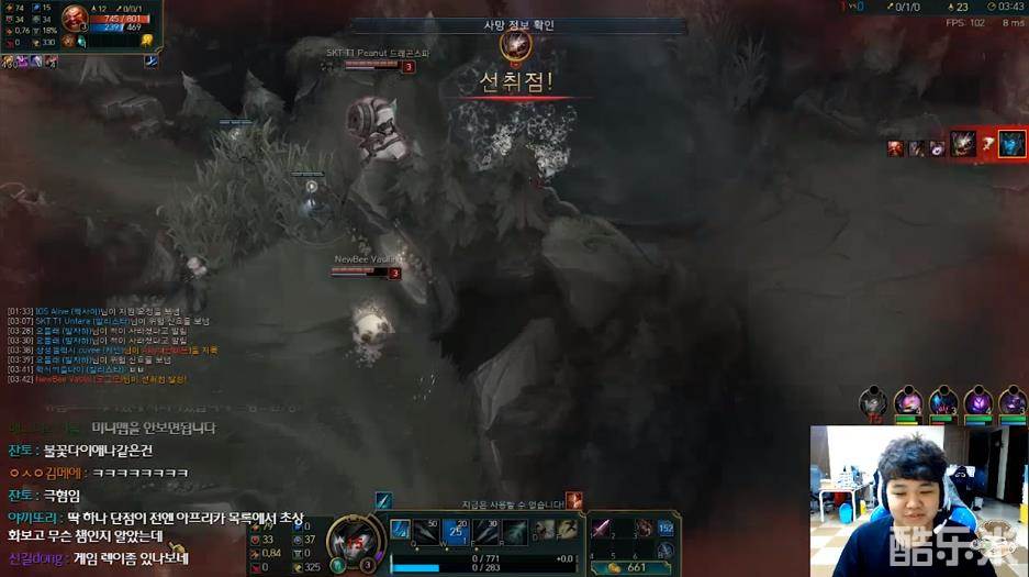 背景:SKT打三星的前一晚,单排中,下路组PraY+Untara,对面打野Peanut。游戏开始3分30秒,对面中野来下路Gank,取得PraY一血。