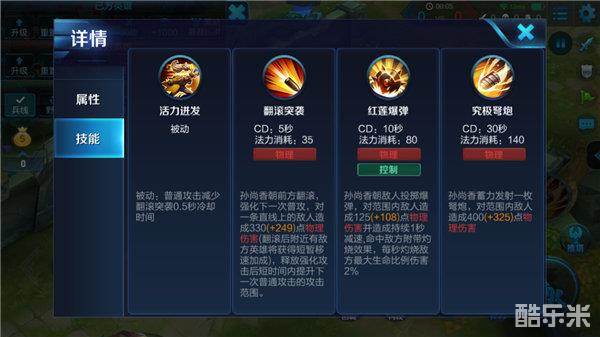 一技能-翻滚突袭:孙尚香朝前方翻滚,并强化下一次普攻,对一条直线上的敌人造成物理伤害。孙尚香伤害主要来源就是依靠一技能,并且还能用来躲避敌方的技能和穿越各种障碍物。