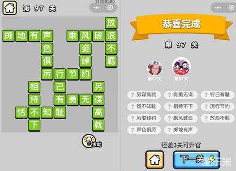 《成语升官记》秀才第97关整个关卡还是有点难度的,但是涉及到的成语都是没有难度的,所以大家只要多想想还是可以轻松过关的,下面就是小编为大家准备的《成语升官记》秀才第97关答案!
