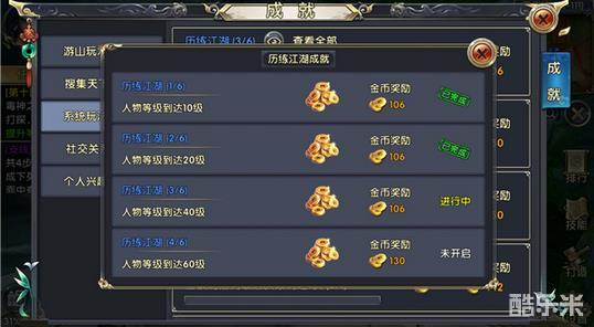 成就”历练江湖“就是记录少侠成为强者的路程。达成这个成就分别需要等级达到10级,20级,40级,60级,80级,100级。