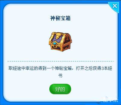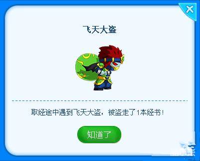 然后是飞天大盗,他会盗走我们的经书。话说回来人物搞错了吧神秘宝箱有两种情况。一种是获得经书。