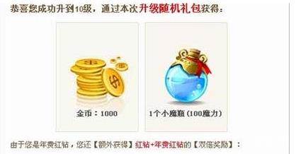 1-50级升级时,都可以随机获取一个礼包。可能是百变卡、金币或魔力。(50级以后升级将不会获得升级奖励)奖品搭配如下: