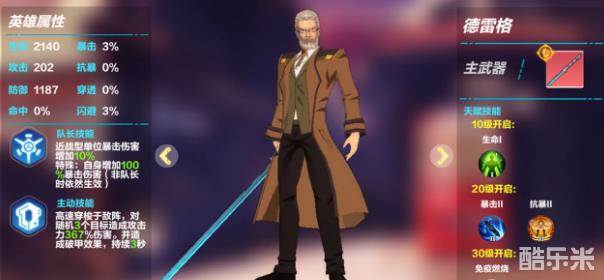 【队长技能】近战型单位伤害增加10%。特殊:自身增加100%暴击伤害(非队长石依然生效)。