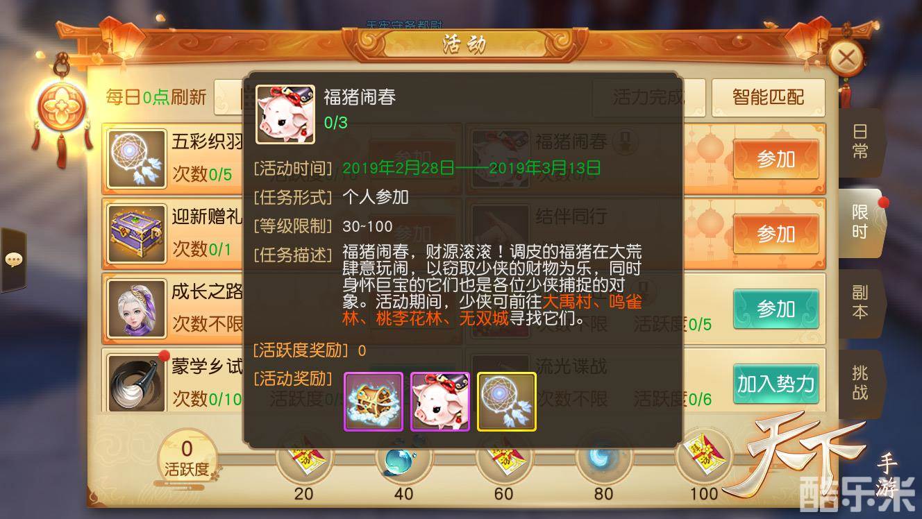 春意渐浓,冬寒已退,《天下》手游“福猪闹春”活动热闹来袭,各位少侠赶紧趁着大好天气,前去偶遇身怀巨宝的福猪们吧!少侠可前往大禹村、鸣雀林、桃李花林、无双城等地,去寻找正在大荒肆意玩乐福猪们,与其一起开展捉迷藏活动。福猪会趁机偷取少侠身上的一定财物然后立即逃跑,无论少侠捉住与否,福猪都会将最后一次窃取的钱财双倍奉还。不过听说福猪只会和身上携带不低于20000军资的少侠玩耍,若想得到福猪青睐,可是要提前准备好巨款旁身的哦!心动就要马上行动,诸位少侠,抓猪去咯!