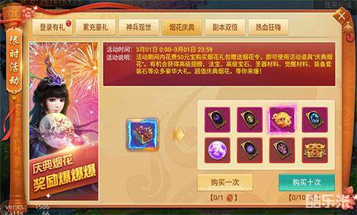 活动说明:活动期间内花费50元宝购买并使用活动道具“庆典烟花”,即有机会获得高级翅膀、法宝、高级宝石、装备套装石等众多豪华大礼。超值庆典烟花,等你来爆!
