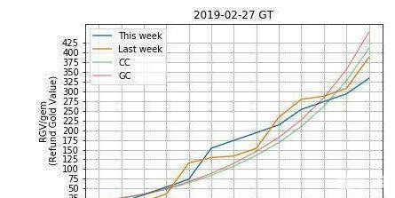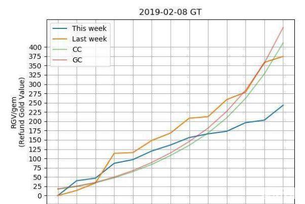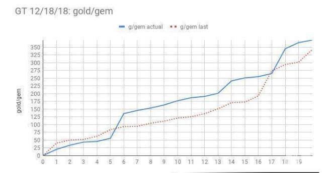 以下以一张图表为大家解说额外奖励的金币/宝石效益比:*蓝色实线为这次的锦标赛,红色虚线为上次的锦标赛,所以这次额外奖励效益比明显高于上一次