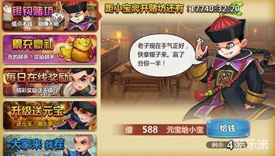 通过进入游戏的活动,可以查看到银钩赌坊。银钩赌坊是官方为感谢玩家对游戏的喜爱与支持,开服乐翻天感恩回馈的活动,投入一点本钱,稳赚不赔。在游戏内将一定数值的元宝借给小宝后,返还大量的元宝,本次活动可以参与5次,银钩赌坊是不容错过的元宝活动。