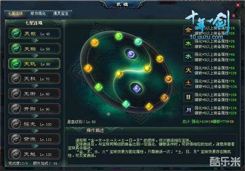 武魂第一大修炼功能就是“七星连珠”了,它能对武器强化和镶嵌的效果进行加成。40-120级间,每10个等级阶段都有一颗主星,共九颗星,不过“七星连珠”中的“七星”指的不是这些主星,而是主星中的七种元素,每种元素分别对应不同的强化和镶嵌功能。