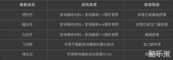 家将精修共包含两种类型,分别为:“三重武诀”精修和“四象将魂”精修。“三重武诀”精修共有三个家将成长属性:生命、攻击、防御;“四象将魂”精修包含四个家将战斗属性:攻击、命中、暴击、闪避。
