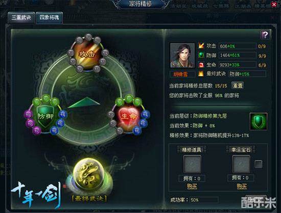 “三重武诀”分别对应提升家将的“生命”、“攻击”、“防御”三个属性,每个属性包含9个层级,共27个层级。最多可点亮其中15个精修层级;