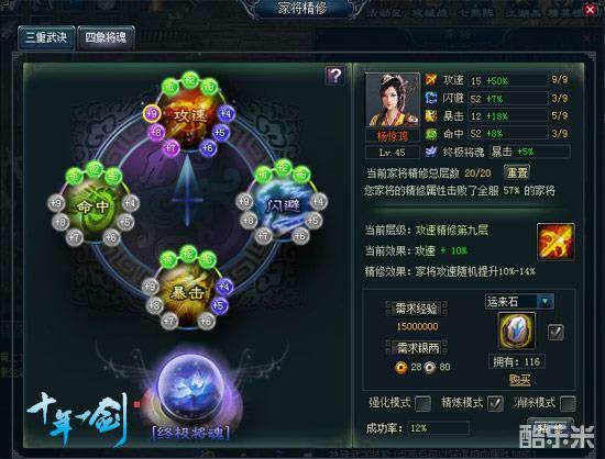 1、其中一项属性的精修完成1-9层的全部点亮,且总点亮层数达到20层,家将会领悟“终极将魂”;