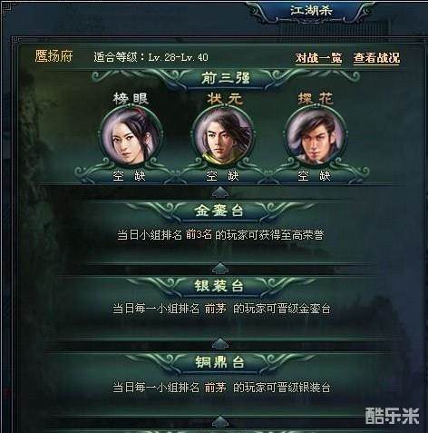 28级以上的玩家都可以报名参加“江湖杀”的比赛,7天为一轮,一轮比赛持续7天,报名的玩家根据自身的等级将会分配到各自适合的级别段内进行 竞技。需要玩家注意的是,每天的9:00-18:00是玩家参与比赛的时间,若你错过了这个时段也不用担心,系统会帮助玩家自动进行竞技的操作,并在当天 18:00点,将比赛的结果公布出来。