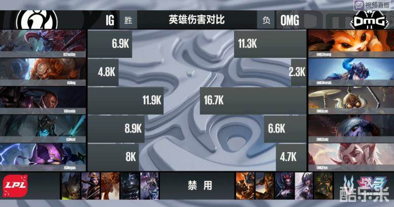 在33分钟时,IG一轮爆发瞬秒大龙后,IG采用一三一分推,来压制OMG,将OMG最后一路下路高地拿下后,IG鳄鱼直接闪现强开,打出了一波完美0换5团战,IG顺势一波推掉了OMG基地,取得比赛胜利。恭喜IG以3:1战胜OMG,成功晋级下一轮。
