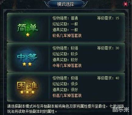进入副本就可以选择难度,简单难度最容易,怪物就和野外怪物差不多,不过由于在副本内不能使用药品补血,所以没有一定的实力还是选择简单难度最好,因为可以最大化的赚取积分。中等难度、困难难度都需要消耗一定的黄金并拥有强大的实力才有通过的机会,所以我们的目标主要放在简单难度上。