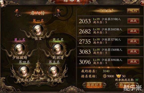 擂台赛每天有10次免费挑战机会,只要你实力够强,这里可是不错的聚宝之处!