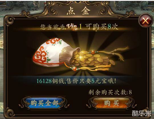 在主城界面中,玩家可以点击“点金”按钮,进入点金界面后,玩家可以用元宝购买铜钱,铜钱售价只需5元宝即可,是不是非常划算呢!